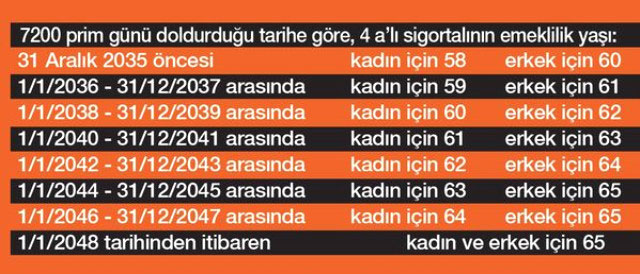 Habertürk’ün haberine göre; emeklilik yaşı, 7200 prim gününün 1 Ocak 2048 tarihinden sonra doldurulması halinde kadın ve erkek için 65 yaş olarak uygulanacak. Bu durumda 1995 doğumlu erkek ya da kadın emekli olabilmek için 65 yaşını dolduracakları 2060 yılını bekleyecek. Bu sene sigorta yaptırarak kesintisiz ödeyen kadınlar, emsallerine göre 6 yıl önce, erkekler ise 3 yıl önce emekli olabilecek.