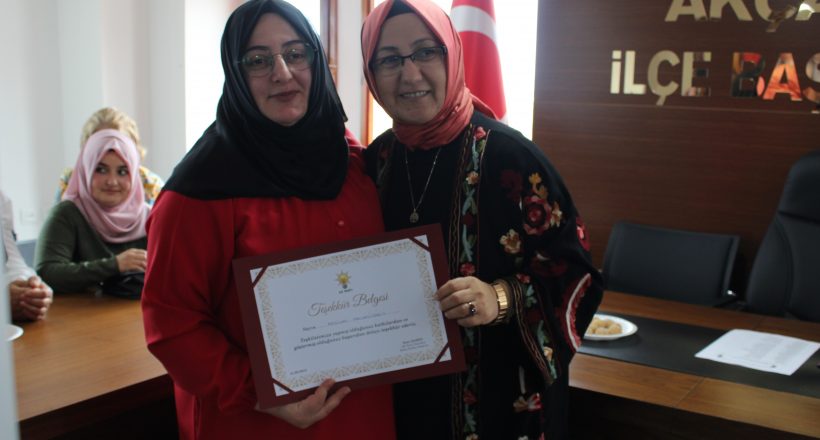Adaletle ve Kalkınma Partisi Akçaabat Kadın Kolları Başkanlığı tarafından gerçekleştirdikleri çalışmalarla partiye destek veren Kadın Kolları Mahalle Başkanları teşekkür belgesi ile ödüllendirildiler.