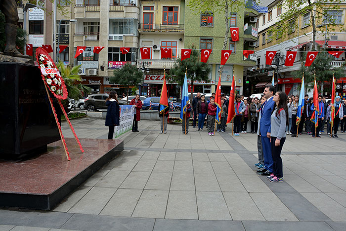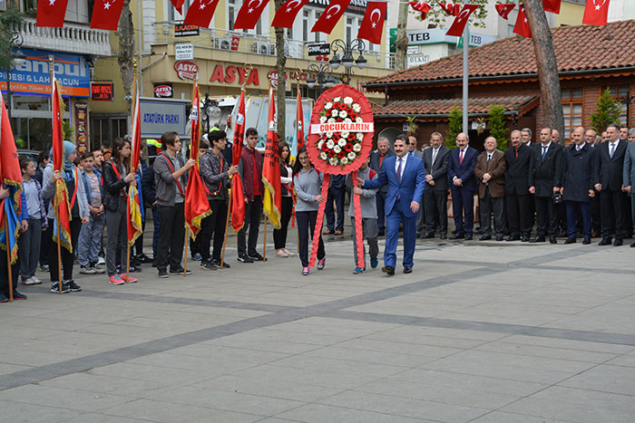 İlçe Milli Eğitim Müdürü Ahmet Üçüncü ve beraberindeki iki öğrenci tarafından üzerinde ‘Çocukların’ yazılı çelen Atatürk Anıtına sunuldu.