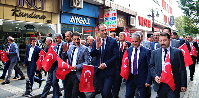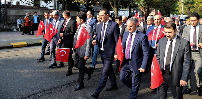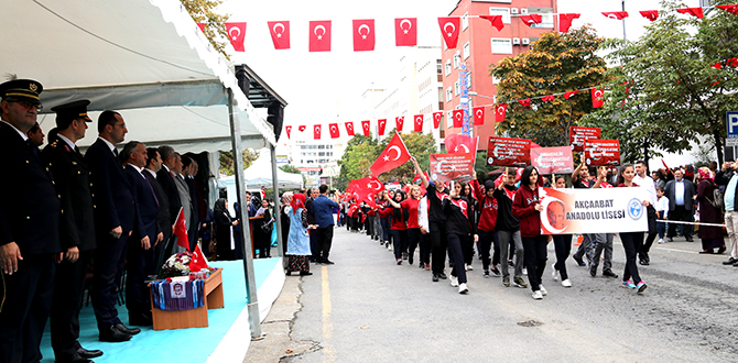 Tebrikat töreninin ardından A.Fazıl Ağanaoğlu İlkokulu önünden protokol üyeleri, öğrenciler ve vatandaşların katılımıyla kortej yürüyüşü gerçekleştirildi. Akçaabat Belediyesi önünde devam eden kutlamalar, Akçaabat Kaymakamı Ramazan Kurtyemez ve Akçaabat Belediye Başkanı Osman Nuri Ekim’in törene katılanları ve halkı selamlamasıyla başladı. Saygı duruşu ve İstiklal Marşı’nın okunmasının ardından günün anlam ve önemini belirten konuşmayı Akçaabat Kaymakamı Ramazan Kurtyemez yaptı. Akçaabat Kaymakamı Ramazan Kurtyemez konuşmasında, büyük bir tarihi değişimi gerçekleştirerek, bağımsız ve çağdaş bir devlet yönetimi armağan eden Atatürk’ü, silah arkadaşlarını, aziz şehitleri, kahraman gazileri, gönül borcu ve sonsuz minnetle andıklarını ifade ederek, “Bugün Türk Milleti olarak ülkemizin dört bir yanında egemenliğin kayıtsız şartsız millete ait olduğunu ilan eden Cumhuriyetimizin 96. Kuruluş yıldönümünü kutluyor olmanın sonsuz gururunu yaşıyoruz. Büyük önder Atatürk’ün Türk Milleti’nin karakterine ve adetlerine en uygun olan idare Cumhuriyet idaresidir diyerek ilan ettiği Cumhuriyet, Türk Milletine bırakılmış en büyük miras ve vazgeçilmez bir değerdir.” dedi.