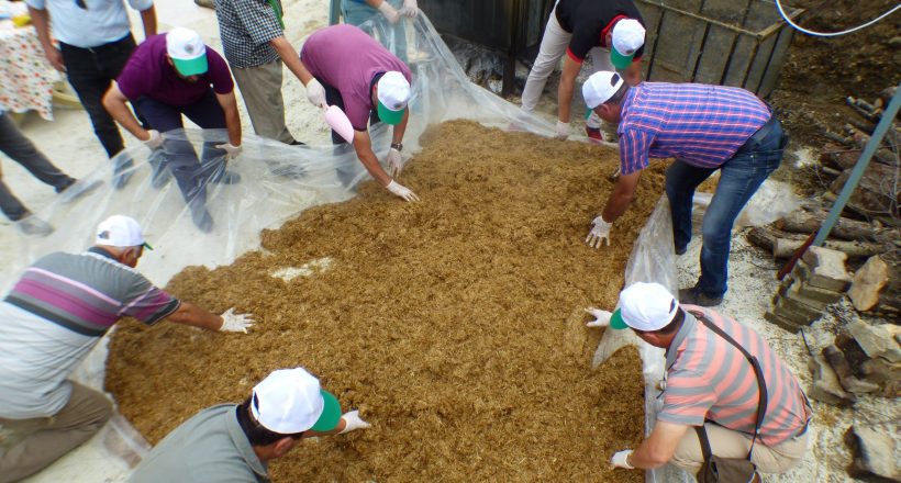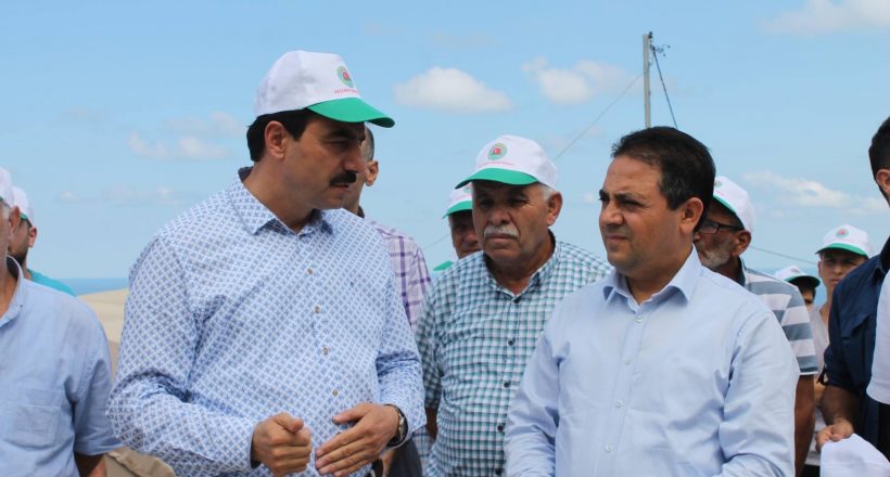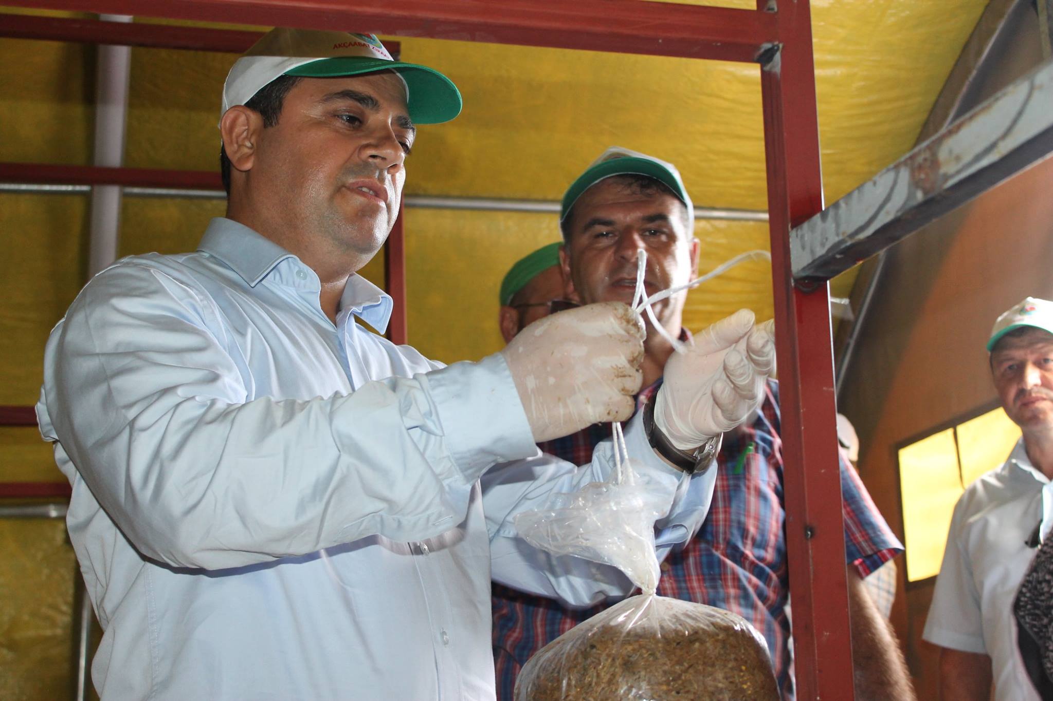 Eğitim Uygulamasına katılan Akçaabat Kaymakamı Soner Şenel üretim seralarında incelemelerde bulunarak seradaki ilk istiridye mantarı ekimini yaptı.