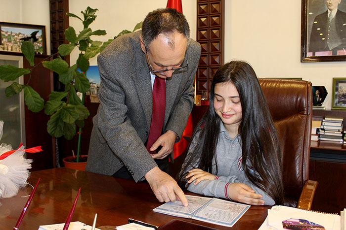 Sembolik devir teslim töreninde öğrenciler, koltuğuna oturdukları kurumlar hakkında bilgi alarak idarecilere sorular sordular.
