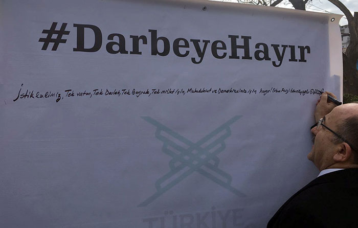 Başkan Gümrükçüoğlu ayrıca “#DarbeyeHayır” sloganıyla oluşturulan hashtag panosunu da imzaladı. Gümrükçüoğlu panoya, “İstiklalimiz, tek vatan, tek devlet, tek bayrak, tek millet için, mukaddesat ve demokrasimiz için hayır” notunu düştü.