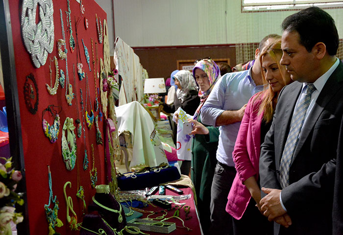 El sanatları ürünlerinin sergilendiği stantları gezen Kaymakam Soner Şenel ve Akçaabat Belediye Başkanı Şefik Türkmen, yapılan çalışmalar hakkında bilgi aldı.