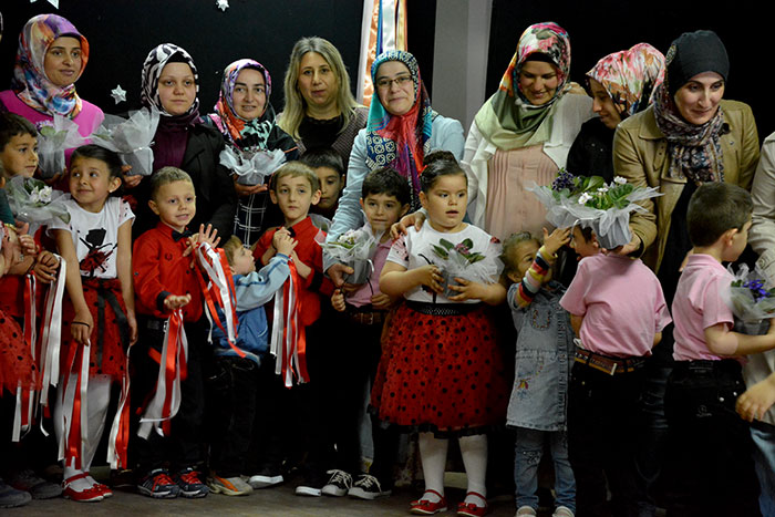 Gösteriler sonrası anasınıfı öğrencilerinin anneleri sahneye davet edilerek, onlara çocukları tarafından çiçekler takdim edildi.