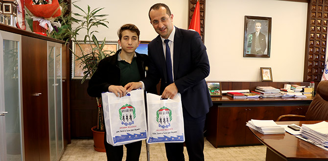 Başkan Ekim, Metehan Ender Ulaş’a çeşitli hediyeler takdim etti.