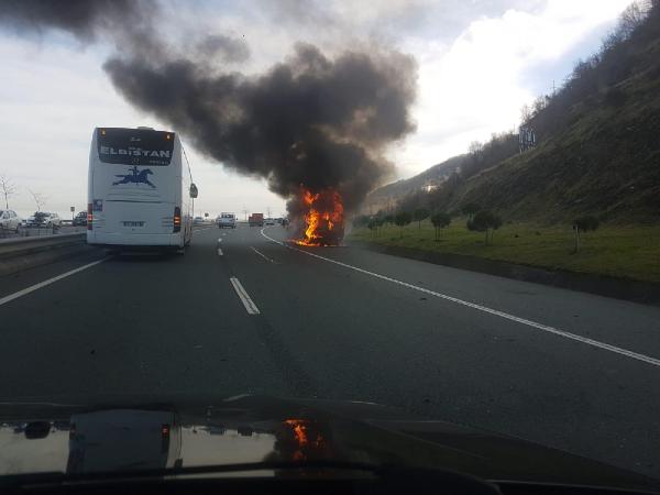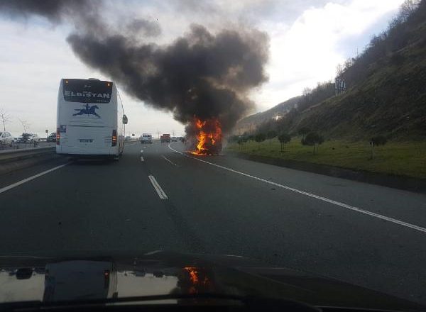 Trabzon’un Akçaabat ilçesinde, Karadeniz Sahil Yolu’nda seyir halindeki servis minibüsü alev aldı. Can kaybı ve yaralanan olmazken minibüs tamamen yandı.