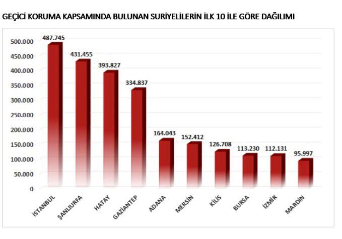 Suriyelilerin en fazla yaşadığı il sıralamasında 487 bin 745 kişiyle İstanbul ilk sırayı alırken, 431 bin 455 kişi ile Şanlıurfa ikinci sırayı aldı.