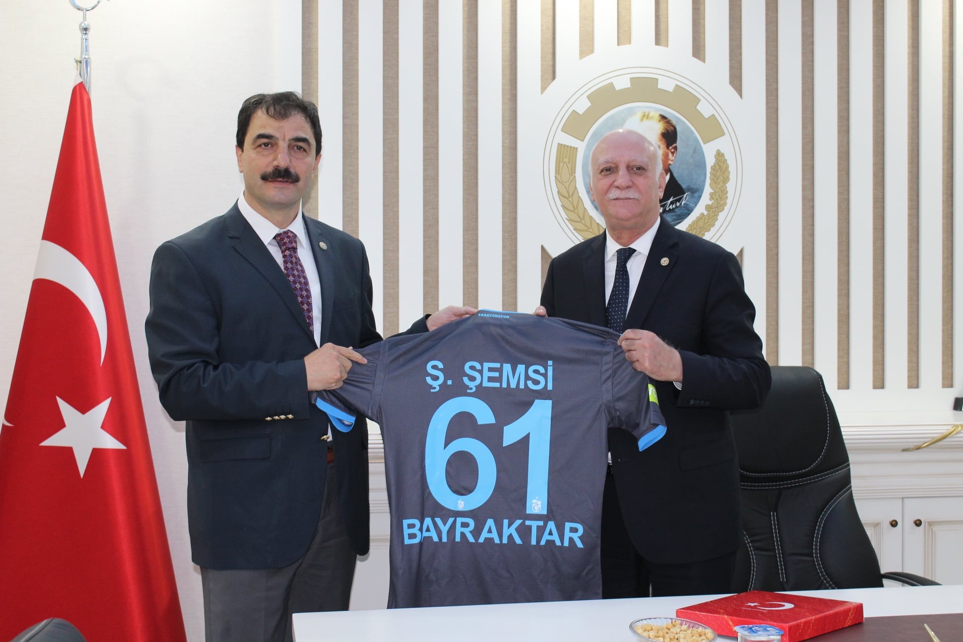 Başkan Eyüpoğlu Genel Başkanı Şemsi Bayraktar ilçemizin tarihi Mahallesi tablosu Trabzonspor 61 numaralı Trabzonspor forması ve içerisinde yöresel ürünlerin bulunduğu sepet hediye etti Genel Başkanı Şemsi Bayraktar tüm oda başkanları ve Türkiye Ziraat Odaları Birliği Genel Başkanı olarak bizim patronumuz çiftçilerimiz dir diyerek tüm Ziraat odalarının çiftçi’nin emrinde olduğunu belirtti Genel Başkanı Şemsi Bayraktar fındık alımları ile ilgili yapmış olduğu değerlendirmede 2019 yılında hastalık ve zararlılara rağmen rekolte de bir miktar Yükseliş olacağını anladık piyasada fındık fiyatlarının düşeceğini önceden kestirerek üreticimizin mağdur olmamasını sağlamak için tüm et odalarımız Toprak mahsulleri ofisi devreye davet etti ilk defa bu yıl odalarımızın milletvekillerinin talepleri doğrultusunda fındık fiyatları hasattan önce paylaşıldı burada Toprak mahsulleri ofisinin piyasaya sokulması için çalışma yapan demeç veren Birlik içerisinde hareket eden tüm o da başkanlarımıza teşekkür ediyorum.