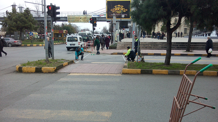 Trafik akış güvenliği ve yaya güvenliğini sağlamak amacıyla başlayan yaya geçidi çalışması Akçaabat meydan sokak da devam ediyor.Yayaların güvenli geçiş yerlerini belirlemek ve araç sürücülerinin belirtilen bu alanda yaya geçişlerine dikkat etmelerini sağlamak üzere başlatılan çalışmada, yolu trafiğe kapatarak yaya geçit alanları sarı renge boyanıyor.